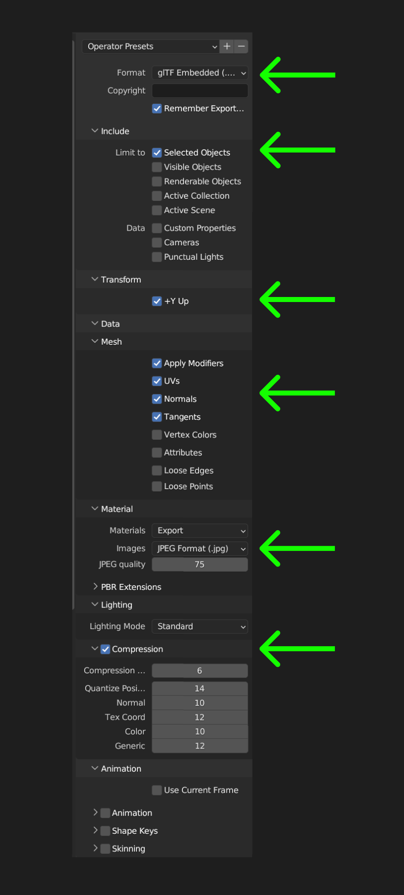 When exporting the GLTF be sure to pick the following values: